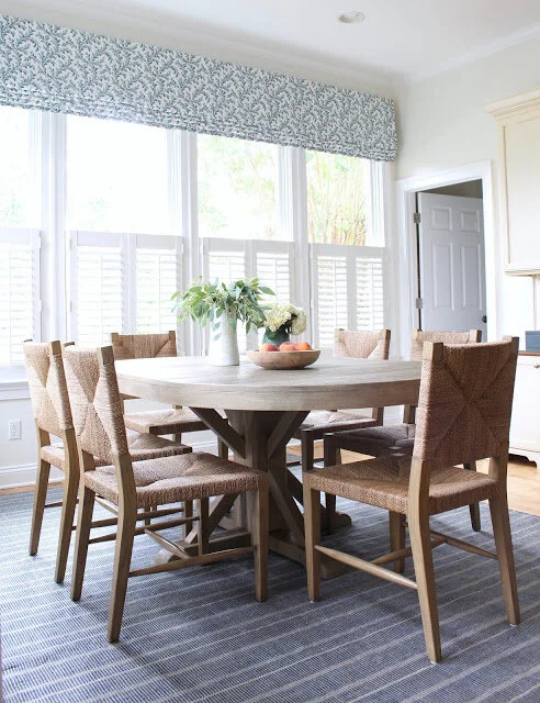 then we added color to the floor by way of an indoor/outdoor navy rug - perfect for a kitchen - and an extending pedestal table with woven chairs.