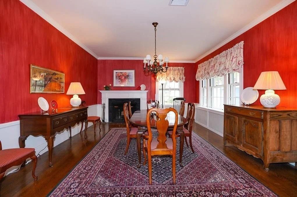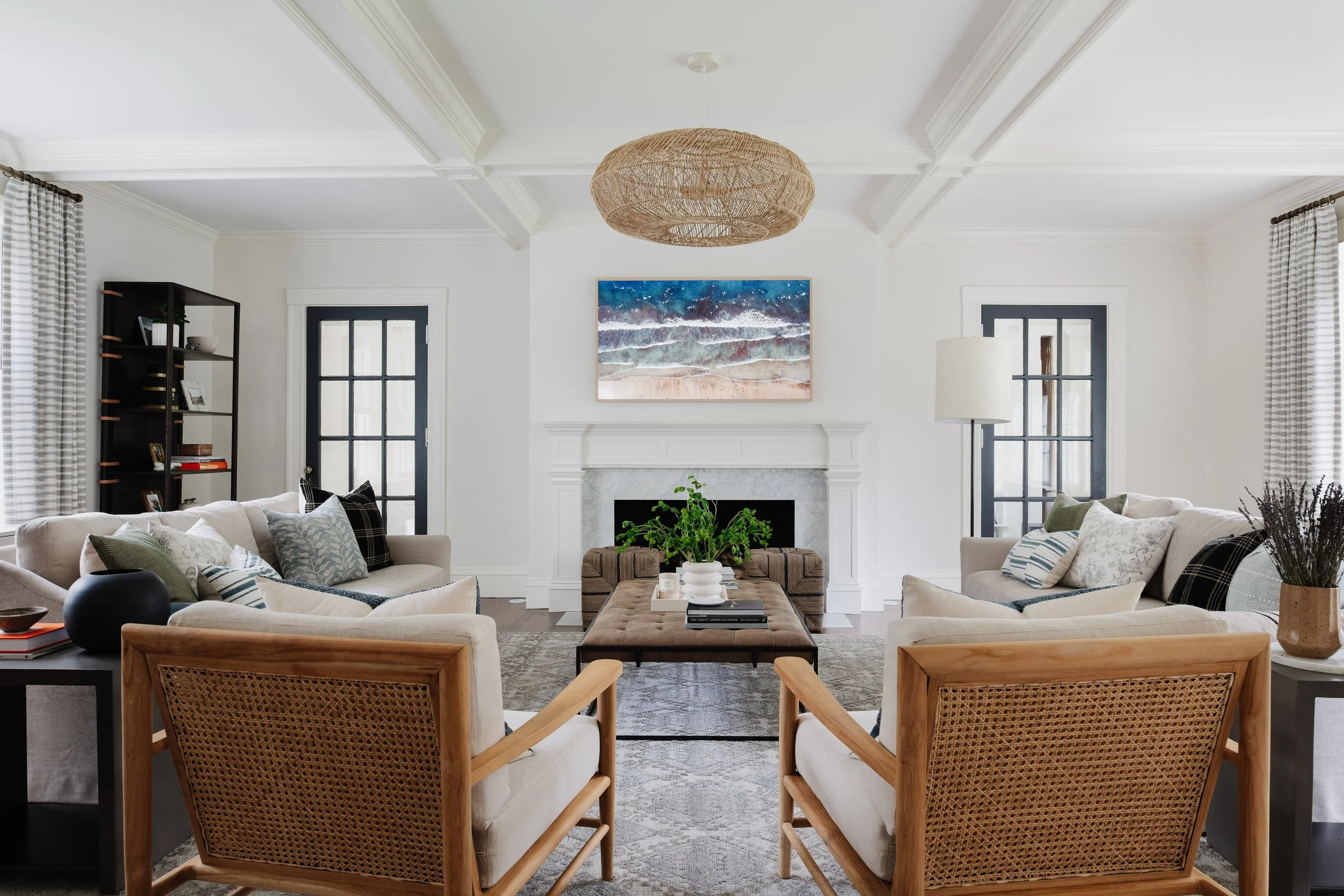 After! In addition to the obvious paint change, we added a coffer detail to the ceiling and changed the original brick on the fireplace to marble and the design of the mantle and surround to more closely match with the dining room fireplace.