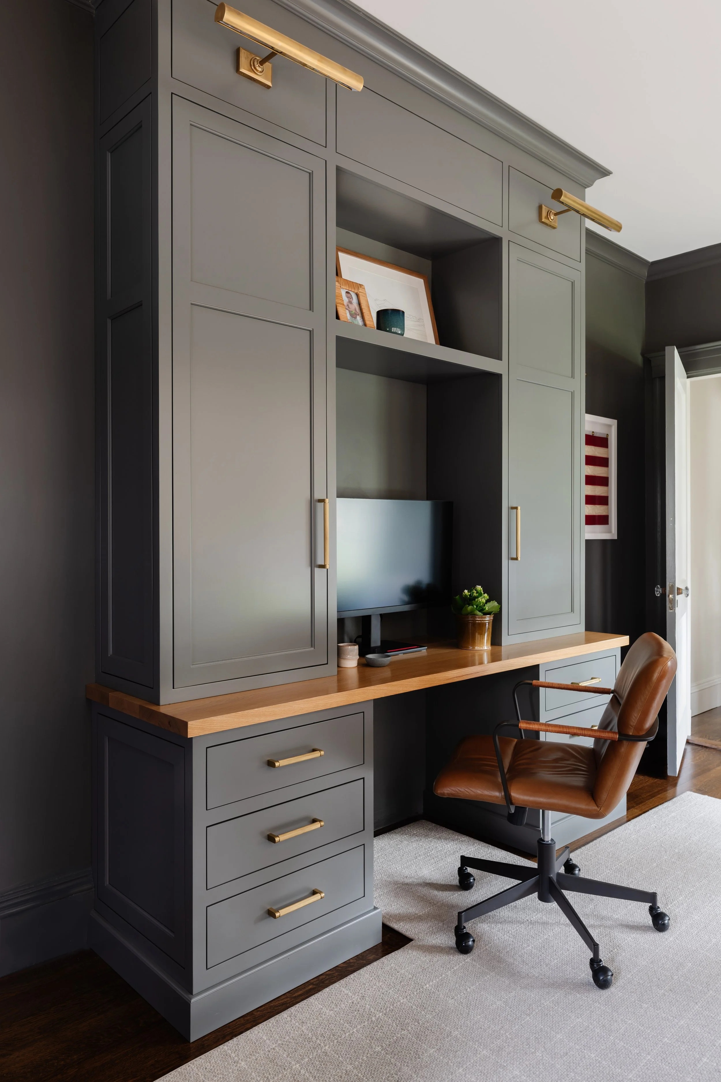 The timing of this office was spot on since we got started just about when Covid hit. Who knew how important this room would become! The facing wall is all windows so it could handle a dark color without feeling like a cave. We chose a deep gray for the walls, trim, and built ins, which aside from being a cool, moody color, helped the room feel larger by keeping everything the same tone. We added warmth with brass fixtures, a white oak desk top, and a leather chair and had the rug cut into the opening of the desk so the chair would move easily.