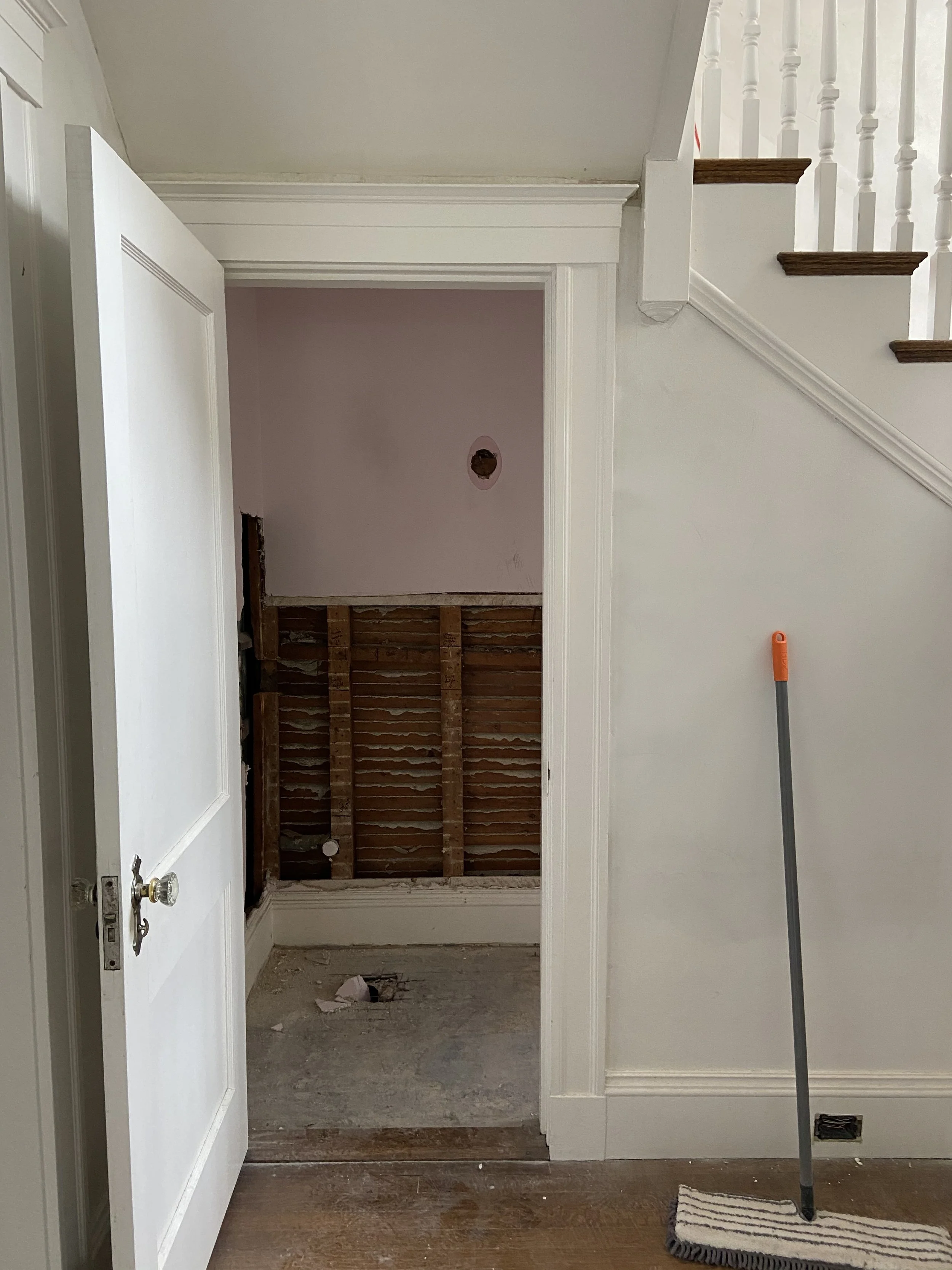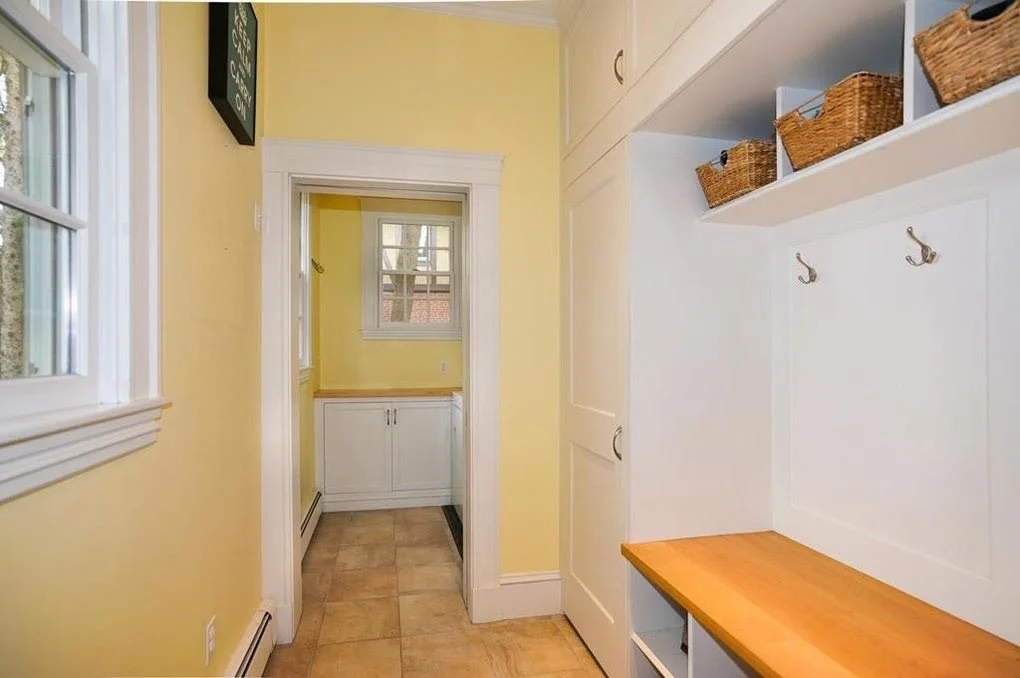 Last stop on the tour is the mudroom. This room was originally separated into two spaces with a wall which felt totally unnecessary. Here is the before!